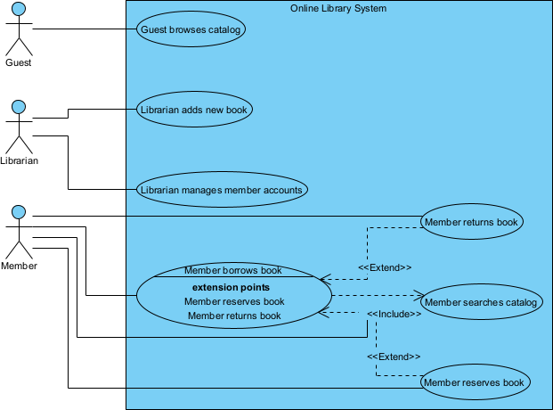 “Create a use case diagram for an online library system. Actors: Member, Librarian, Guest. Main use cases: Member borrows book, Member returns book, Member searches catalog, Member reserves book, Librarian adds new book, Librarian manages member accounts, Guest browses catalog. Include relationships like extends (reserve if book is borrowed) and includes (borrow includes search).”